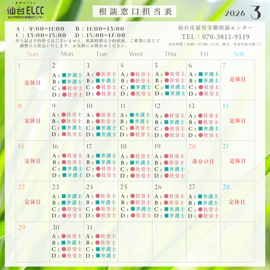 仙台市雇用労働相談センターでは、弁護士と社会保険労務士が当番制で相談対応を行っています。
