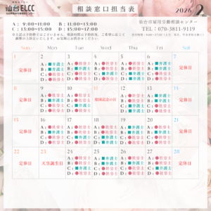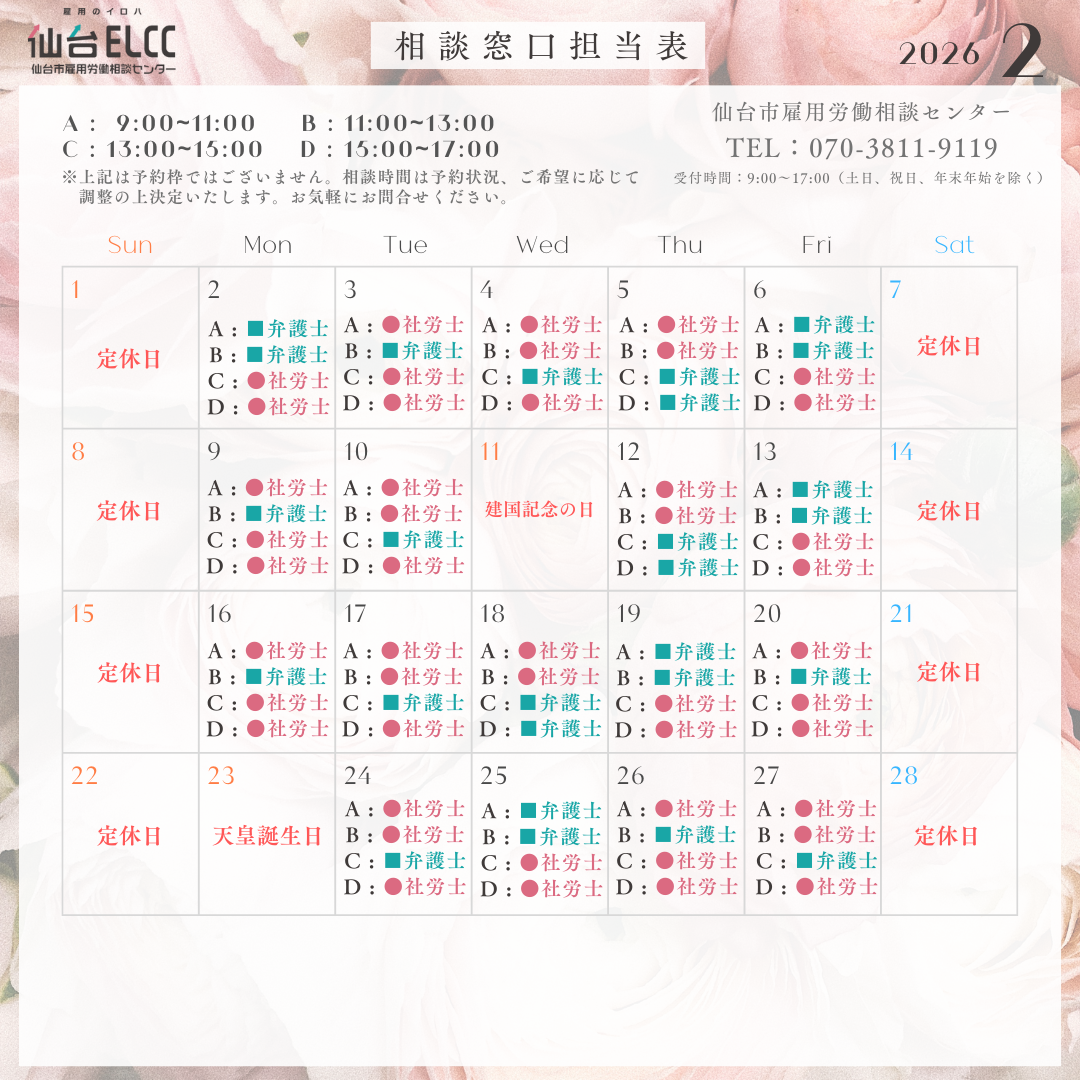 仙台市雇用労働相談センターでは、弁護士と社会保険労務士が、当番制で相談対応を行っています。 2月の相談員のスケジュール(シフト)を掲載いたしますので、ご予約やご相談の参考にご覧ください。